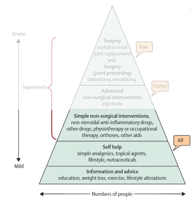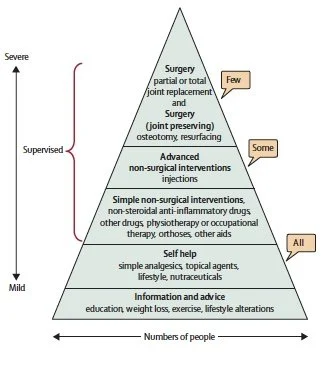 The treatment pyramid is fantastic for giving us a summary of the guidelines - what we should be doing with our osteoarthritis at various points of severity.