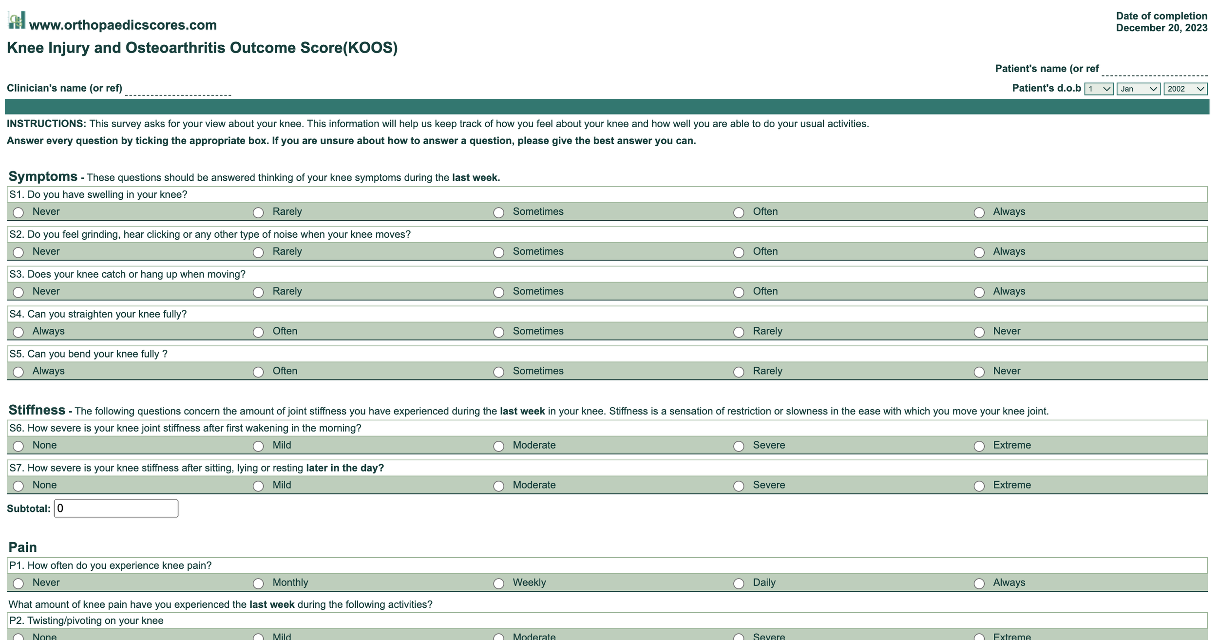 Enter your name and date at the top, and once done click print page at the bottom. You can then save as a pdf, or print a copy for your records. If you are under physiotherapy care, we would suggest giving a copy of the completed KOOS to your practitioner (email pdf, or bring in copy for scanning) so they have an outcome they can monitor.
